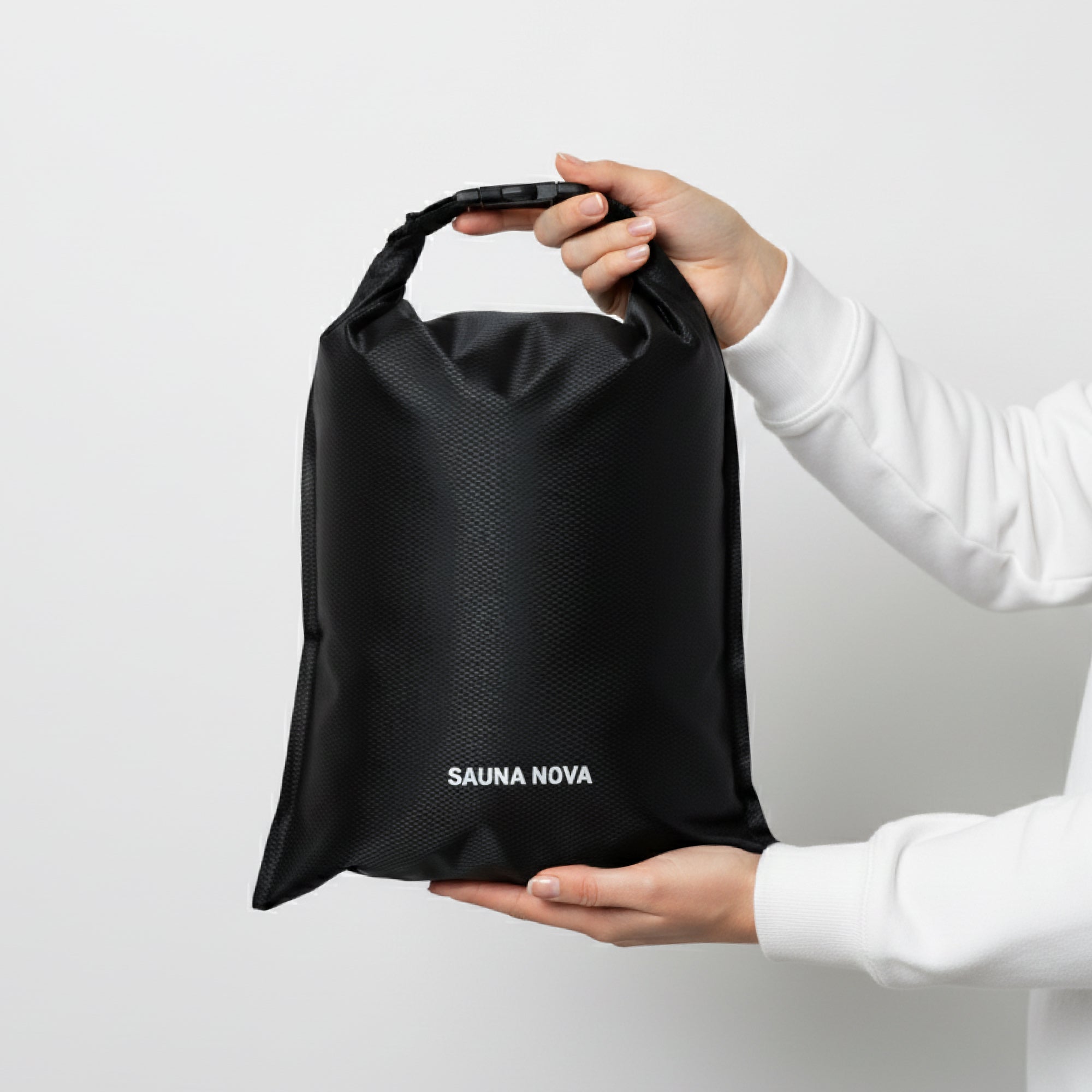 サウナ後の濡れたアイテムも安心。軽くて防水仕様のポリエステルバッグが、水滴や湿気からしっかり守ります。くるくる巻いて留めるだけで簡単密閉、使わない時はコンパクトに収納可能。